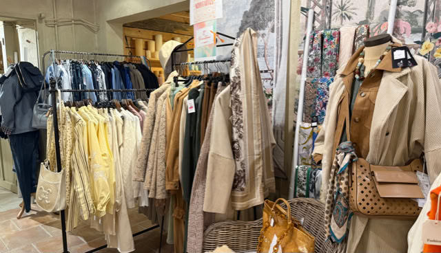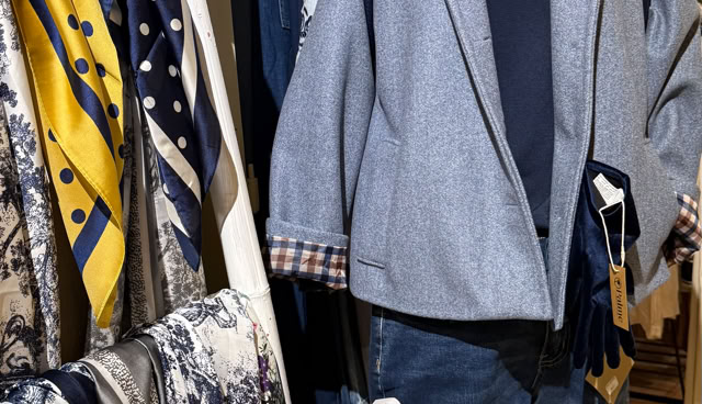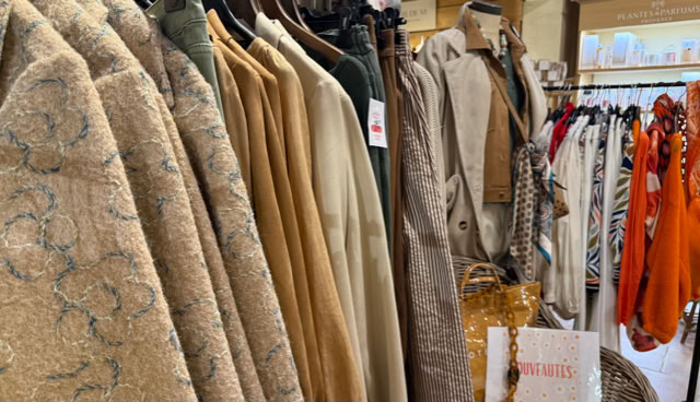 Vêtements suspendus sur des cintres, y compris des vestes à carreaux et des manteaux de différentes couleurs, avec un mannequin portant une écharpe orange et un sac à main.