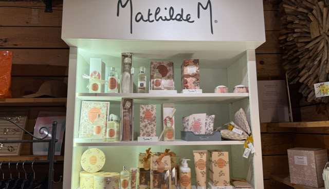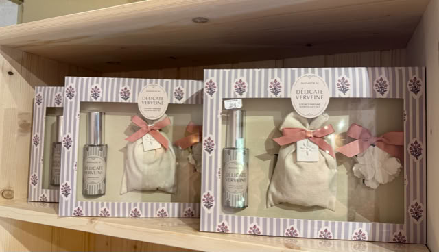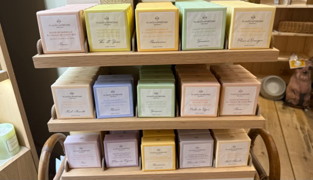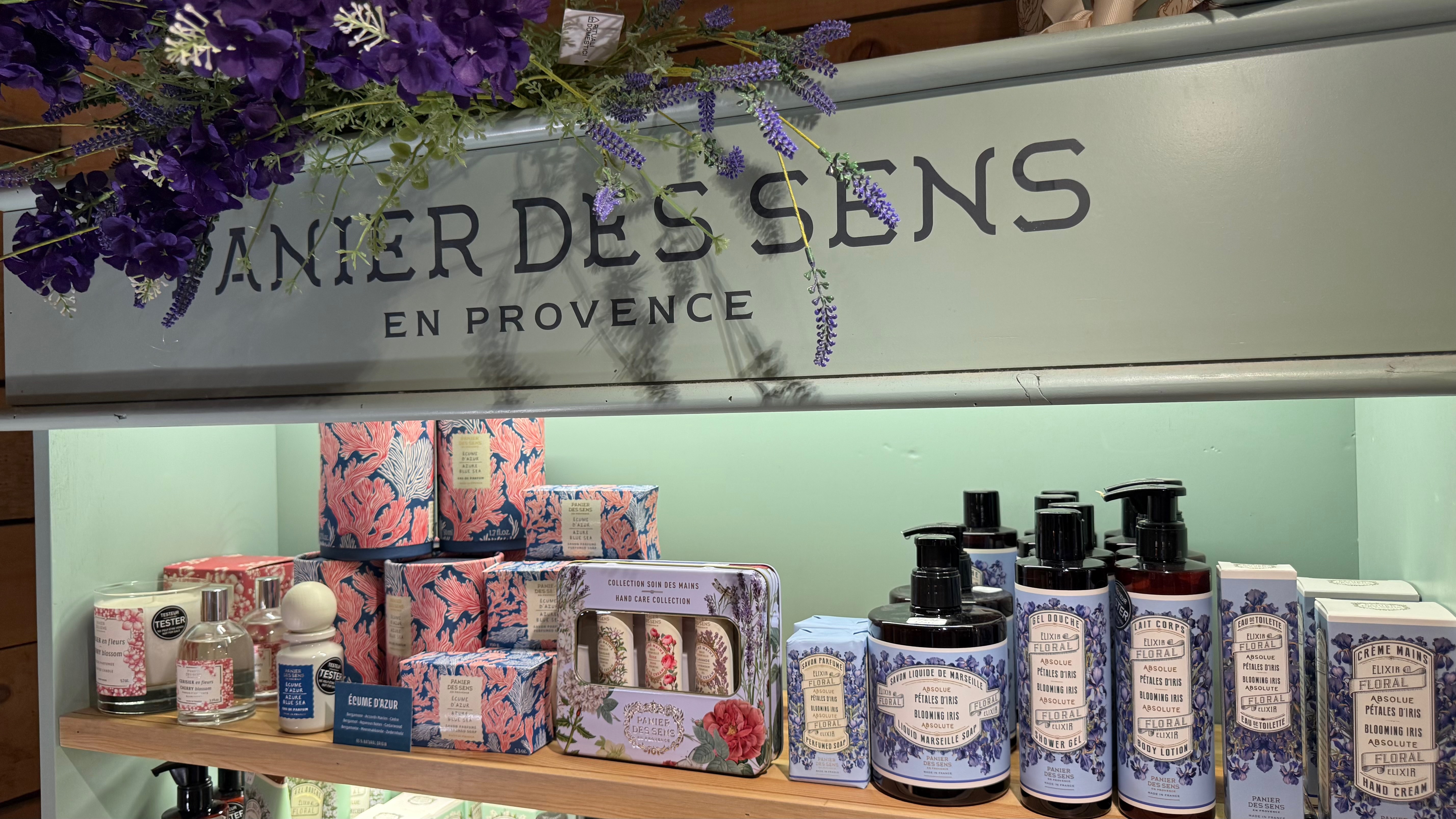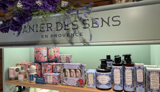 Produits de beauté et soins sur une étagère, avec des emballages décorés de motifs floraux et le texte "Panier des Sens en Provence" en arrière-plan.