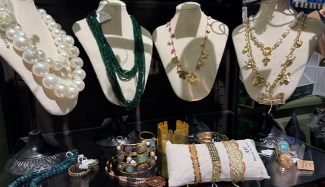 Vitrine avec divers colliers suspendus, comprenant des chaînes dorées et des perles colorées, ainsi que des flacons de parfum et des boîtes sur l'étagère inférieure.