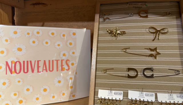 Boîte avec le mot "NOUVEAUTES" à gauche et présentoir de bijoux dorés à droite.