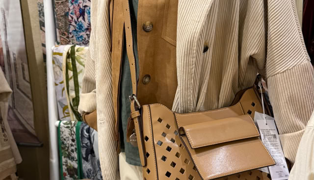 Mannequin portant un manteau beige et une chemise marron, avec un sac à main perforé marron en bandoulière, entouré de sacs et d'écharpes colorées.