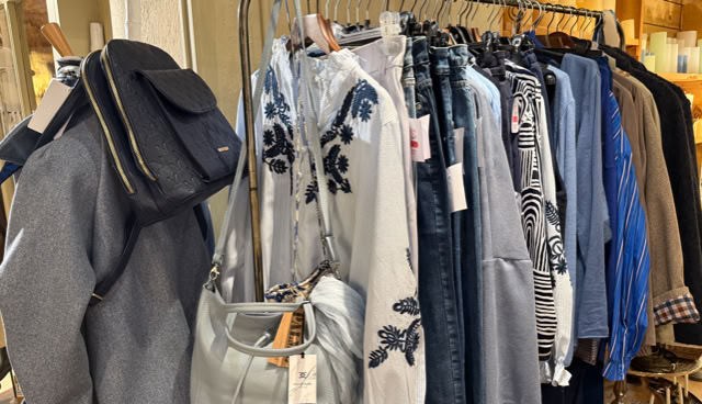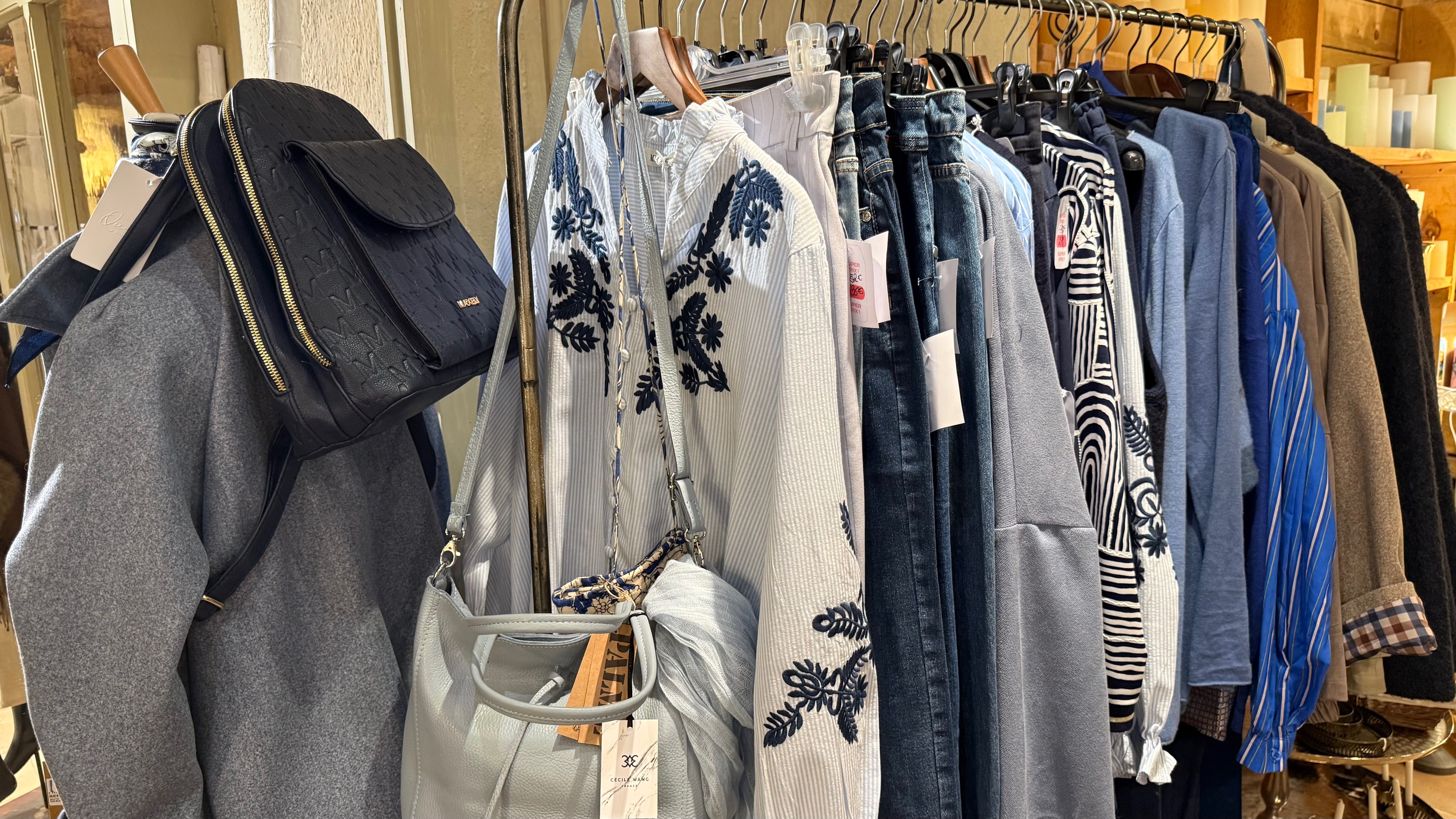 Vêtements suspendus sur un portant, comprenant des vestes, des chemises et un sac à main argenté.