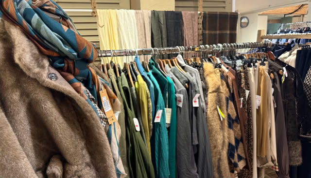Vêtements suspendus sur des cintres, y compris des vestes à carreaux et des manteaux de différentes couleurs, avec un mannequin portant une écharpe orange et un sac à main.