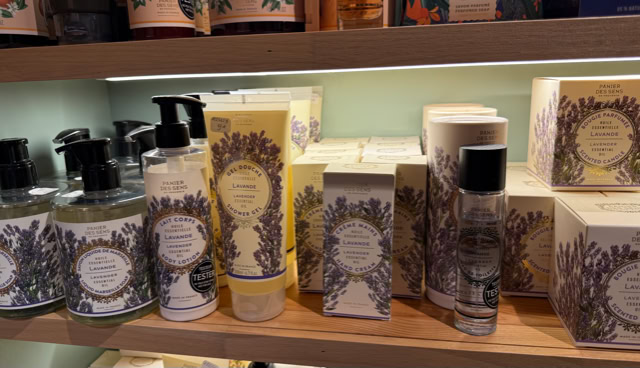 Produits de beauté et soins sur une étagère, avec des emballages décorés de motifs floraux et le texte "Panier des Sens en Provence" en arrière-plan.