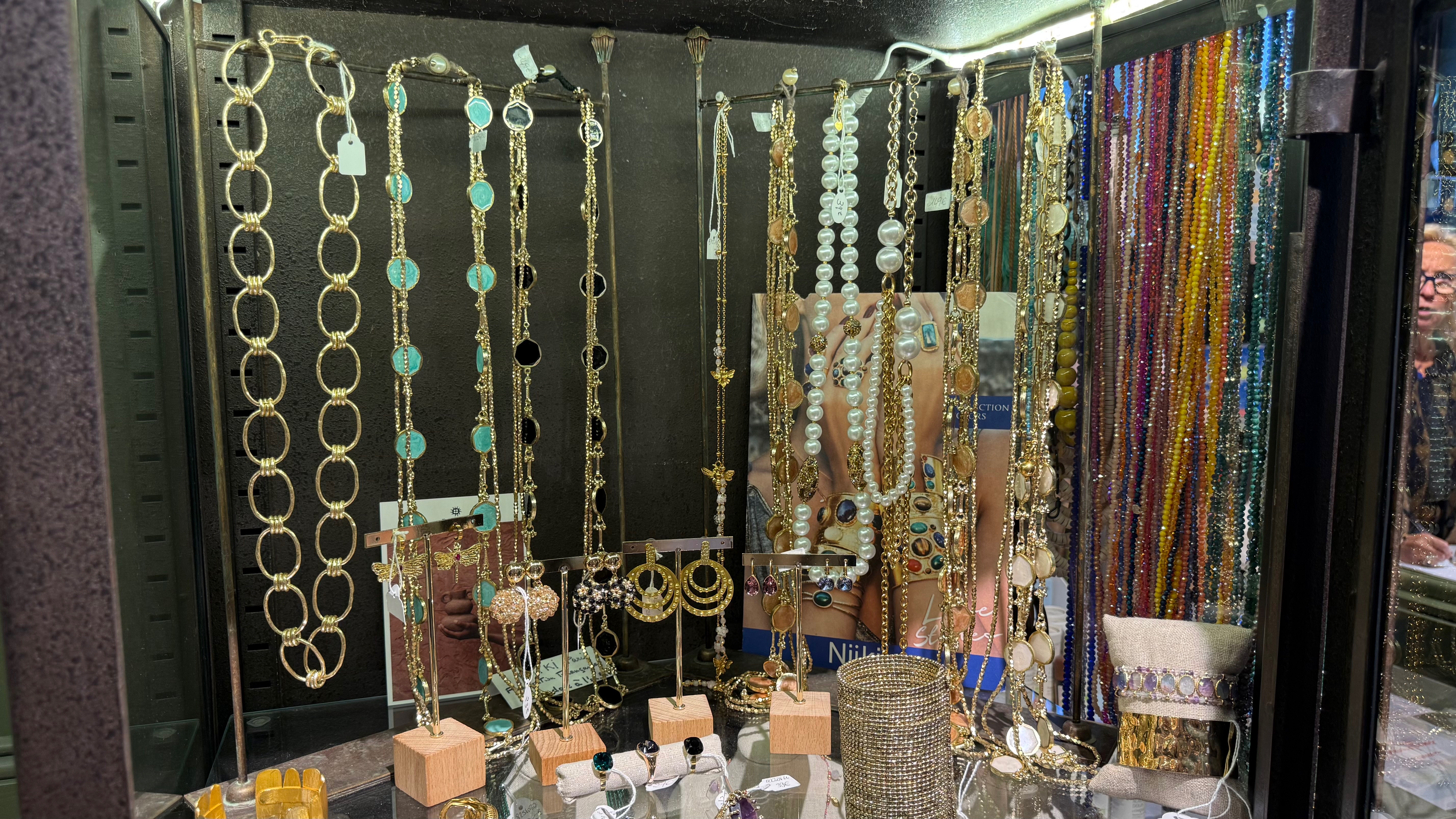 Vitrine avec divers colliers suspendus, comprenant des chaînes dorées et des perles colorées, ainsi que des flacons de parfum et des boîtes sur l'étagère inférieure.