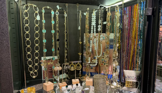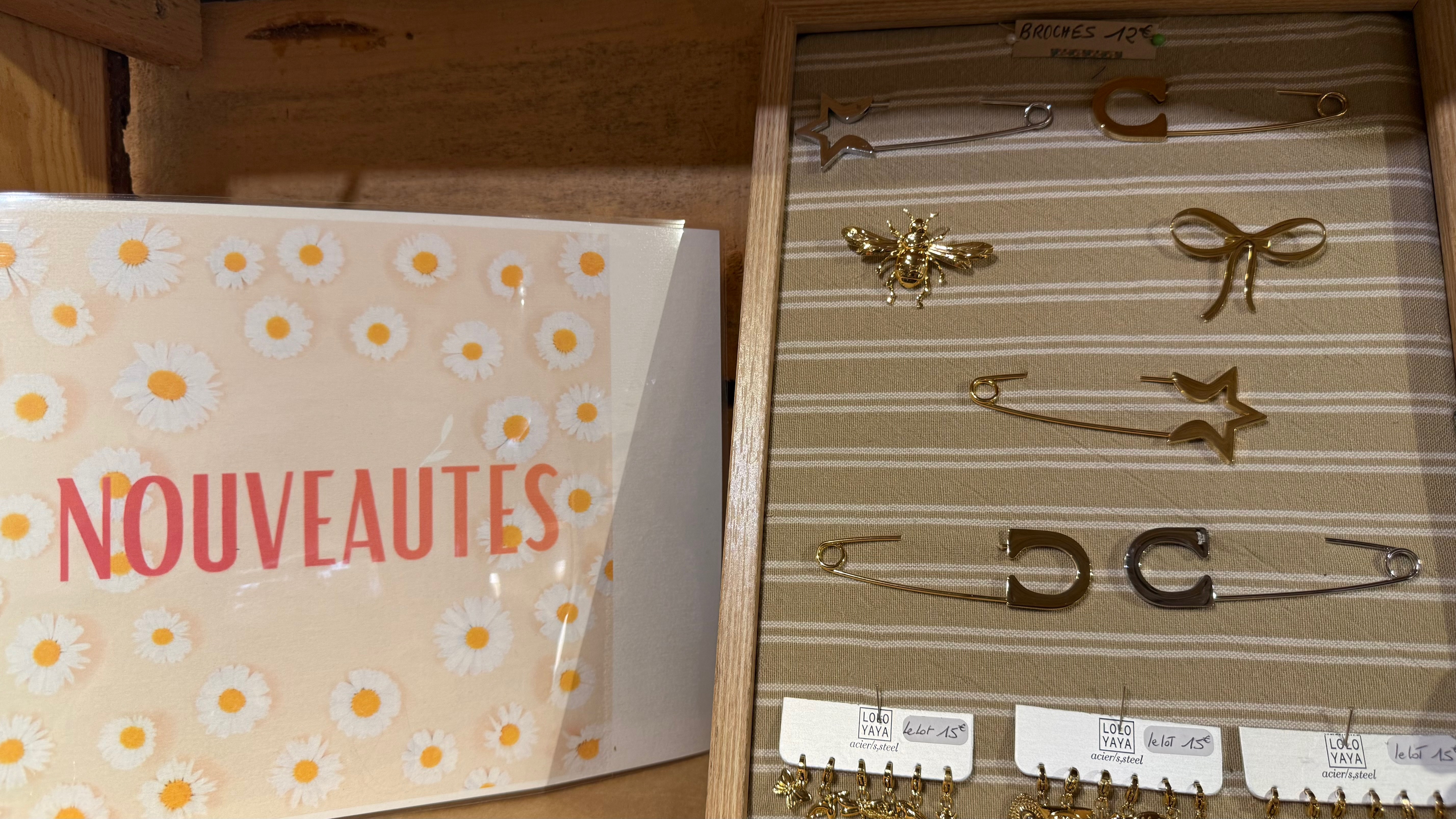 Boîte avec le mot "NOUVEAUTES" à gauche et présentoir de bijoux dorés à droite.
