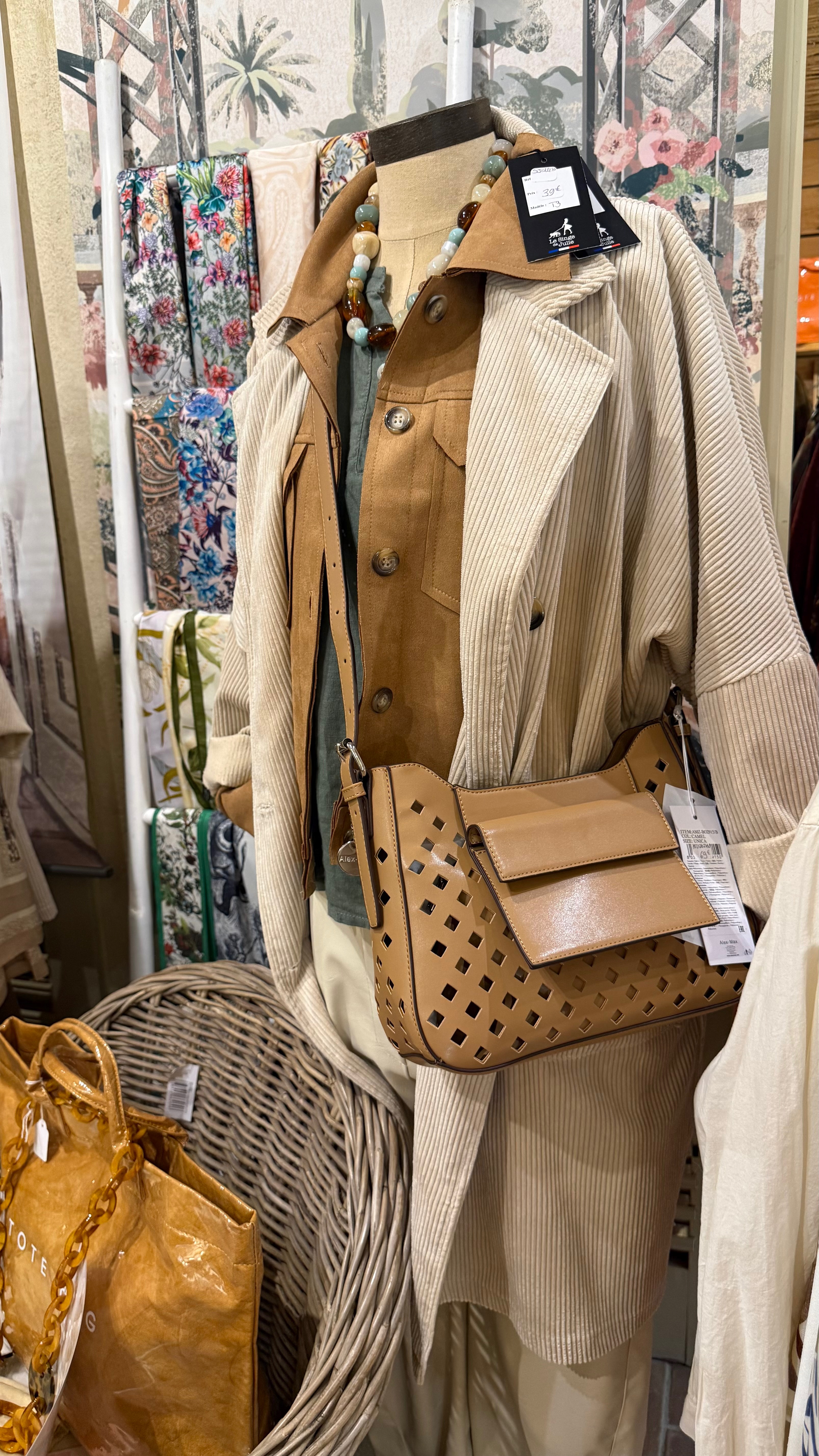 Mannequin portant un manteau beige et une chemise marron, avec un sac à main perforé marron en bandoulière, entouré de sacs et d'écharpes colorées.